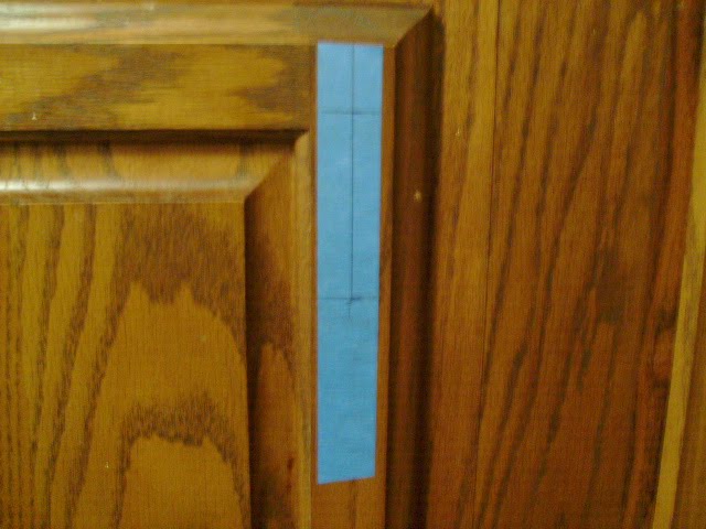 As with all jobs, this one was more difficult and time consuming than I thought it would be. First, I had to make sure I got the cabinets marked correctly. I placed a piece of paint tape on the cabinet, use my trusty quilting ruler to find the exact places to drill and mark them. It took a good bit of pressure to get through the wood.